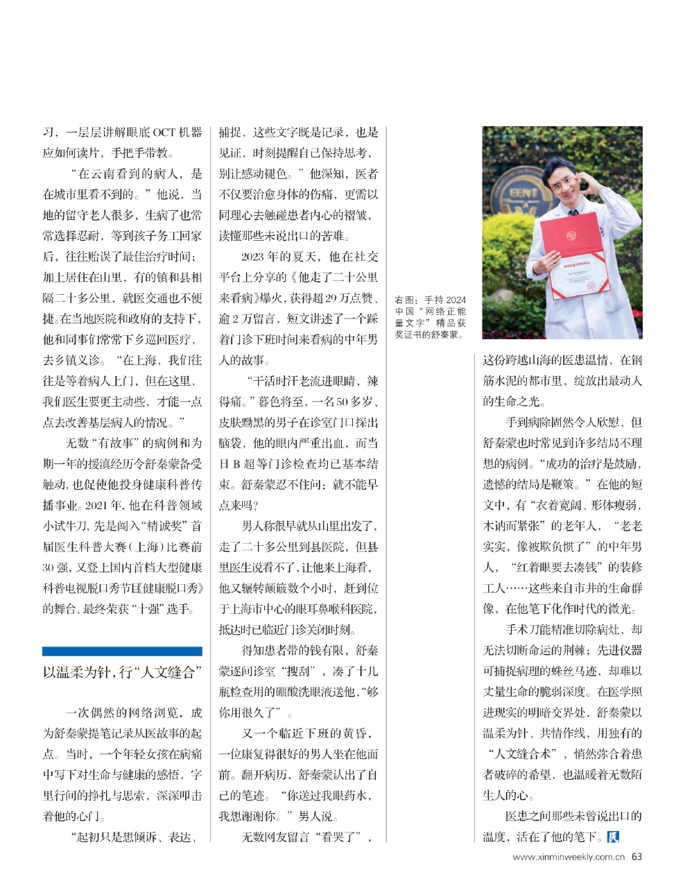 这位博主的身份,是复旦大学附属眼耳鼻喉科医院眼科医生舒秦蒙。像这样的“爆款网文”,他还有很多。10多年的从医生涯中,发生了许多令他印象深刻的病例和故事;得空时,他便以值班医生的视角、细腻真实的文风、坦诚直率的表达,将门急诊的人间百态毫无保留地铺陈开来。
