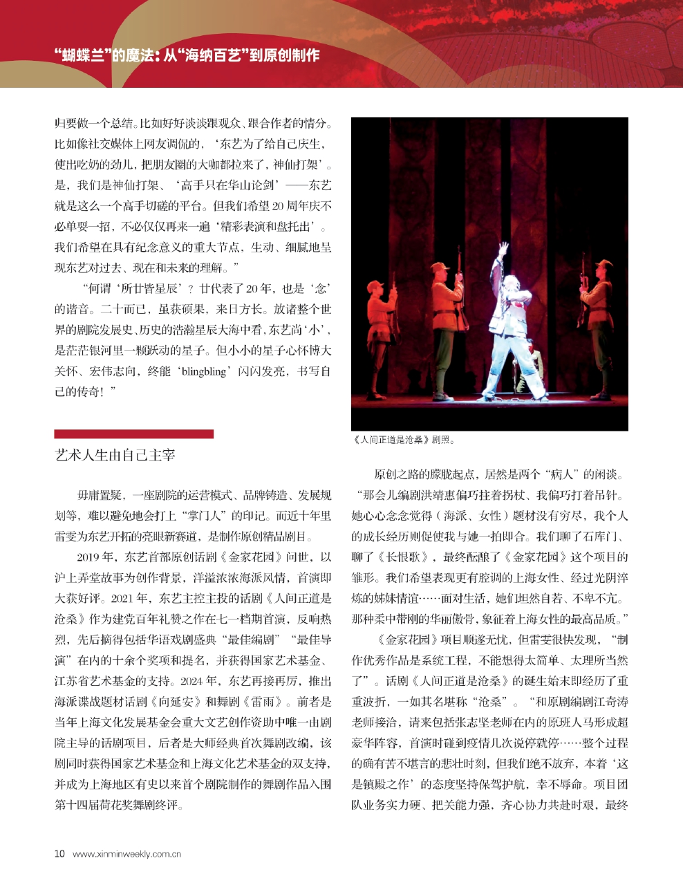 “我们是一家危机感很强的剧院。要让政府、社会认可你的经营理念、服务态度、执行力,就必须永不懈怠。坚守海派文化,东艺是当仁不让的践行者。上海大步迈向亚洲演艺之都,坐标浦东的东艺即倡导推动国际项目,搭建艺术沟通桥梁。红色文化激荡交融,东艺积极响应,‘又红又火’的原创精品获得了国家艺术基金的扶持。可以说,目前无论是运营项目还是制作剧目,东艺都属于国内一流水平。而我作为总经理,最重要的是‘负责’,是承担最大的压力。总经理扛压的前提下,中层起到基石作用。东艺对项目的选择有一套自己的评估体系,项目评估小组既包括公司高层,也包括各部门负责人,有时候还要引入外脑。大家畅所欲言,各述利弊,算好社会效益和经济效益两笔账。头脑风暴的结果必然客观,而一旦做好决定,我们团结一致、众志成城。”