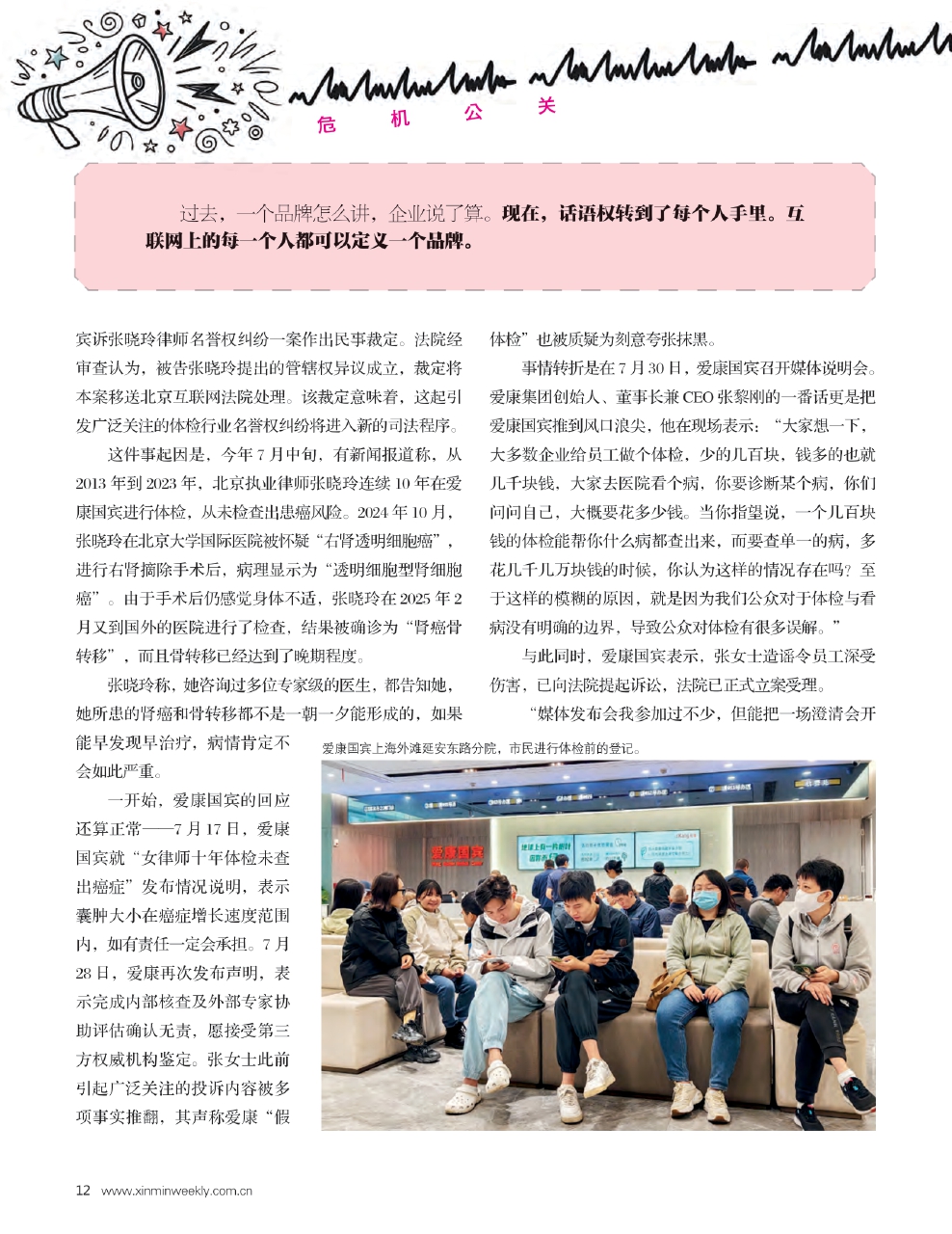 这件事起因是,今年7月中旬,有新闻报道称,从2013年到2023年,北京执业律师张晓玲连续10年在爱康国宾进行体检,从未检查出患癌风险。2024年10月,张晓玲在北京大学国际医院被怀疑“右肾透明细胞癌”,进行右肾摘除手术后,病理显示为“透明细胞型肾细胞癌”。由于手术后仍感觉身体不适,张晓玲在2025年2月又到国外的医院进行了检查,结果被确诊为“肾癌骨转移”,而且骨转移已经达到了晚期程度。