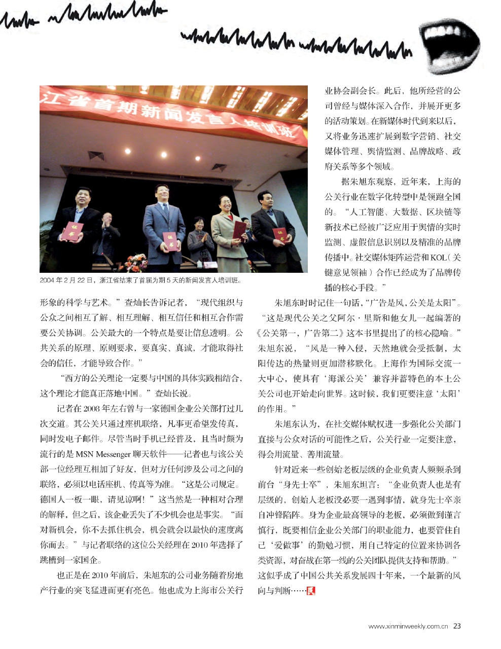 也正是在2010年前后,朱旭东的公司业务随着房地产行业的突飞猛进而更有亮色。他也成为上海市公关行业协会副会长。此后,他所经营的公司曾经与媒体深入合作,并展开更多的活动策划。在新媒体时代到来以后,又将业务迅速扩展到数字营销、社交媒体管理、舆情监测、品牌战略、政府关系等多个领域。