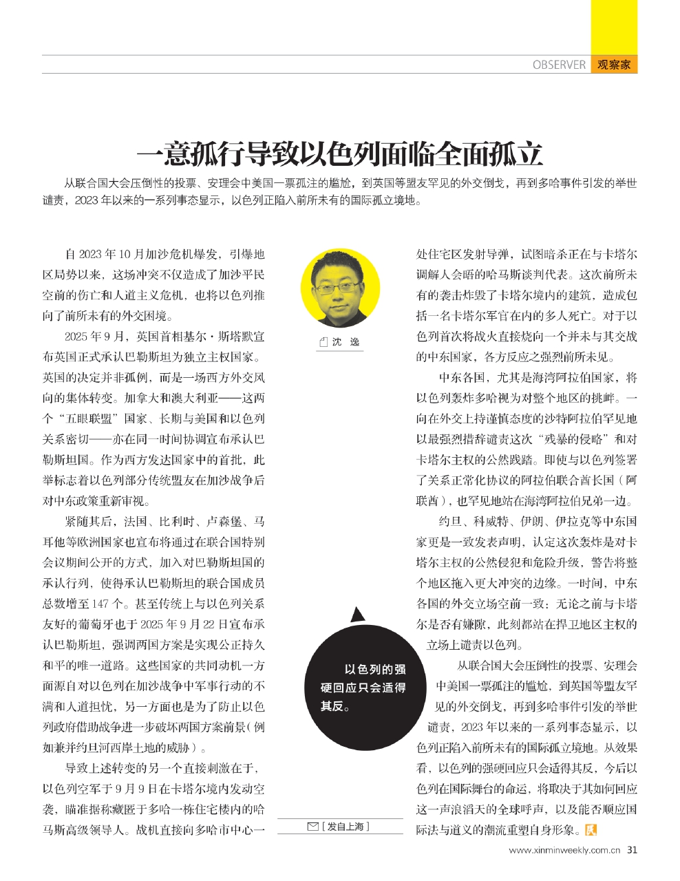 从联合国大会压倒性的投票、安理会中美国一票孤注的尴尬,到英国等盟友罕见的外交倒戈,再到多哈事件引发的举世谴责,2023年以来的一系列事态显示,以色列正陷入前所未有的国际孤立境地。
