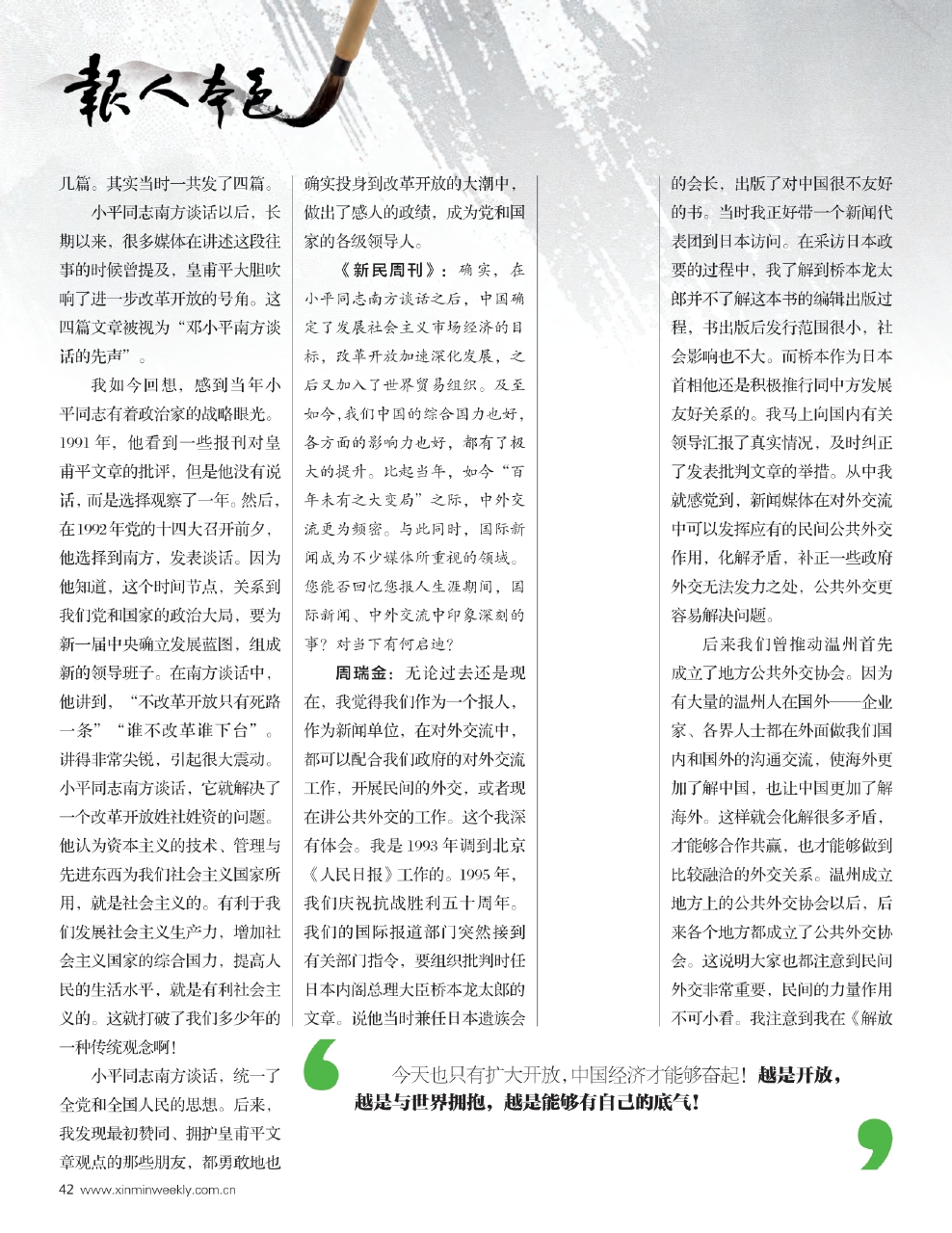 周瑞金:无论过去还是现在,我觉得我们作为一个报人,作为新闻单位,在对外交流中,都可以配合我们政府的对外交流工作,开展民间的外交,或者现在讲公共外交的工作。这个我深有体会。我是1993年调到北京《人民日报》工作的。1995年,我们庆祝抗战胜利五十周年。我们的国际报道部门突然接到有关部门指令,要组织批判时任日本内阁总理大臣桥本龙太郎的文章。说他当时兼任日本遗族会的会长,出版了对中国很不友好的书。当时我正好带一个新闻代表团到日本访问。在采访日本政要的过程中,我了解到桥本龙太郎并不了解这本书的编辑出版过程,书出版后发行范围很小,社会影响也不大。而桥本作为日本首相他还是积极推行同中方发展友好关系的。我马上向国内有关领导汇报了真实情况,及时纠正了发表批判文章的举措。从中我就感觉到,新闻媒体在对外交流中可以发挥应有的民间公共外交作用,化解矛盾,补正一些政府外交无法发力之处,公共外交更容易解决问题。