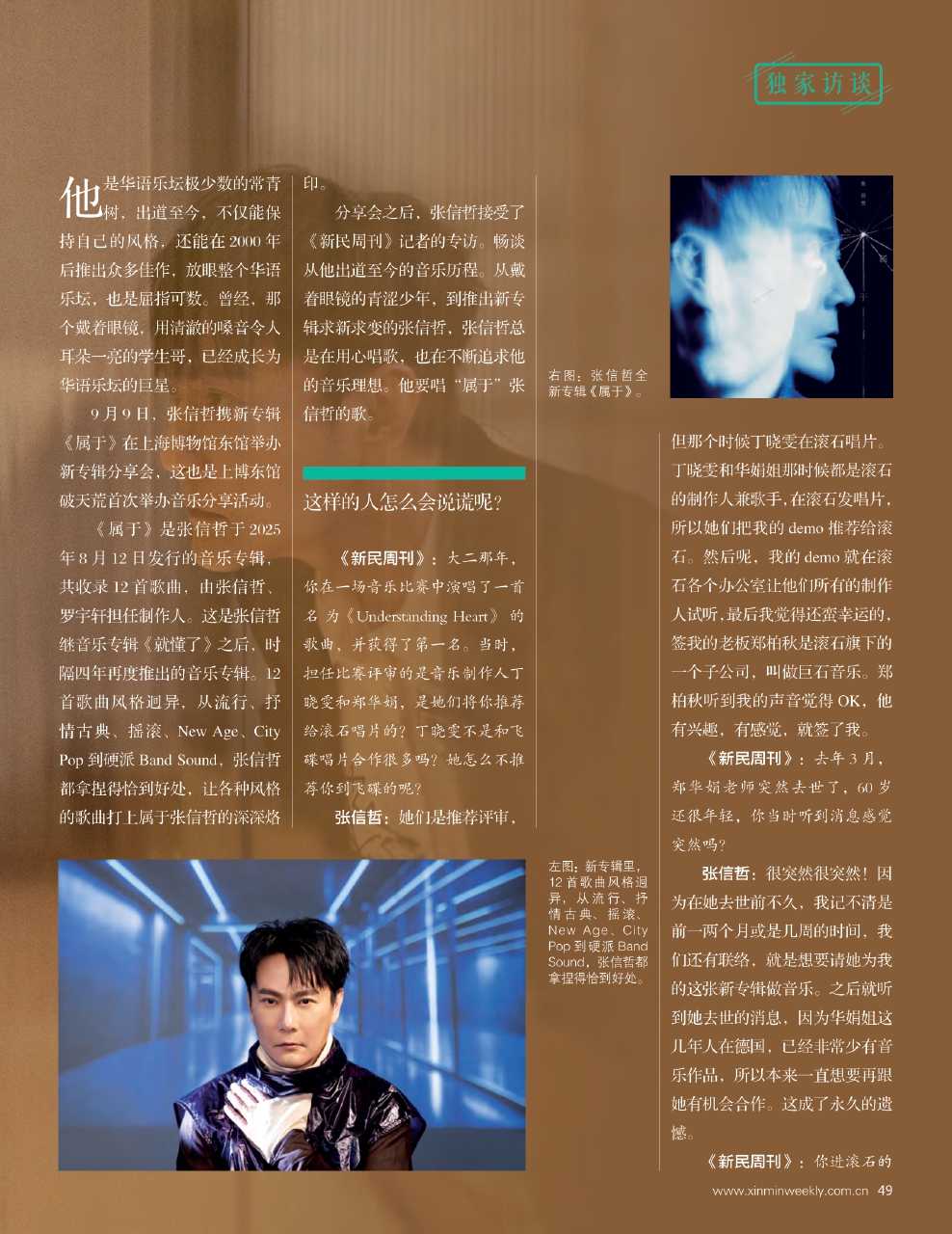 分享会之后,张信哲接受了《新民周刊》记者的专访。畅谈从他出道至今的音乐历程。从戴着眼镜的青涩少年,到推出新专辑求新求变的张信哲,张信哲总是在用心唱歌,也在不断追求他的音乐理想。他要唱“属于”张信哲的歌。