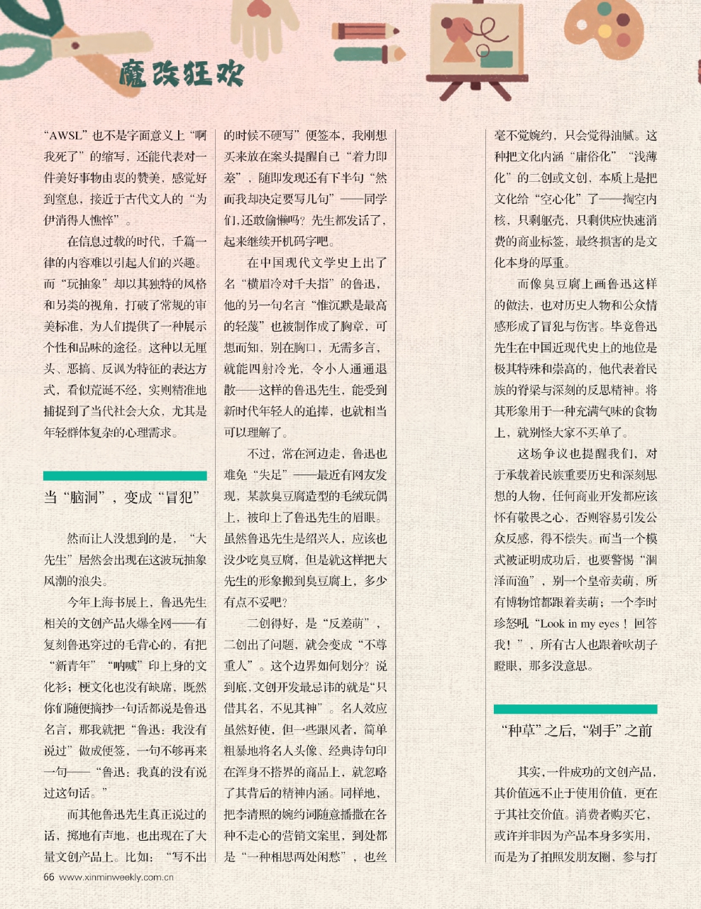 二创得好,是“反差萌”,二创出了问题,就会变成“不尊重人”。这个边界如何划分?说到底,文创开发最忌讳的就是“只借其名,不见其神”。名人效应虽然好使,但一些跟风者,简单粗暴地将名人头像、经典诗句印在浑身不搭界的商品上,就忽略了其背后的精神内涵。同样地,把李清照的婉约词随意播撒在各种不走心的营销文案里,到处都是“一种相思两处闲愁”,也丝毫不觉婉约,只会觉得油腻。这种把文化内涵“庸俗化”“浅薄化”的二创或文创,本质上是把文化给“空心化”了——掏空内核,只剩躯壳,只剩供应快速消费的商业标签,最终损害的是文化本身的厚重。