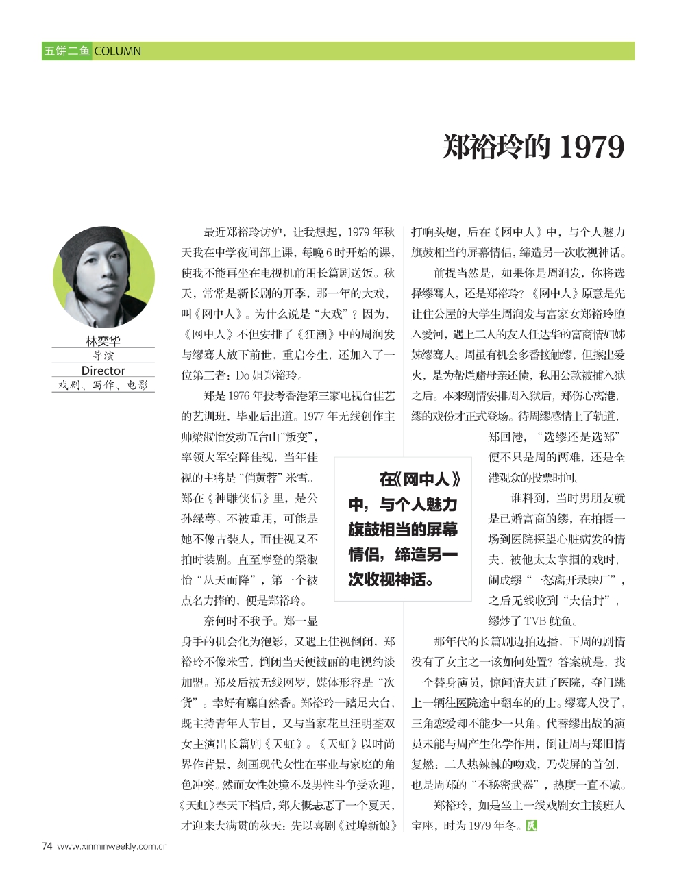 最近郑裕玲访沪,让我想起,1979年秋天我在中学夜间部上课,每晚6时开始的课,使我不能再坐在电视机前用长篇剧送饭。秋天,常常是新长剧的开季,那一年的大戏,叫《网中人》。为什么说是“大戏”?因为,《网中人》不但安排了《狂潮》中的周润发与缪骞人放下前世,重启今生,还加入了一位第三者:Do姐郑裕玲。