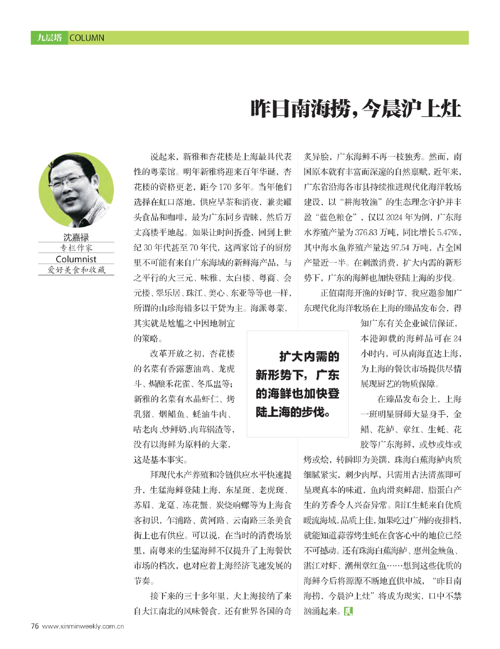 正值南海开渔的好时节,我应邀参加广东现代化海洋牧场在上海的臻品发布会,得知广东有关企业诚信保证,本港卸载的海鲜品可在24小时内,可从南海直达上海,为上海的餐饮市场提供尽情展现厨艺的物质保障。