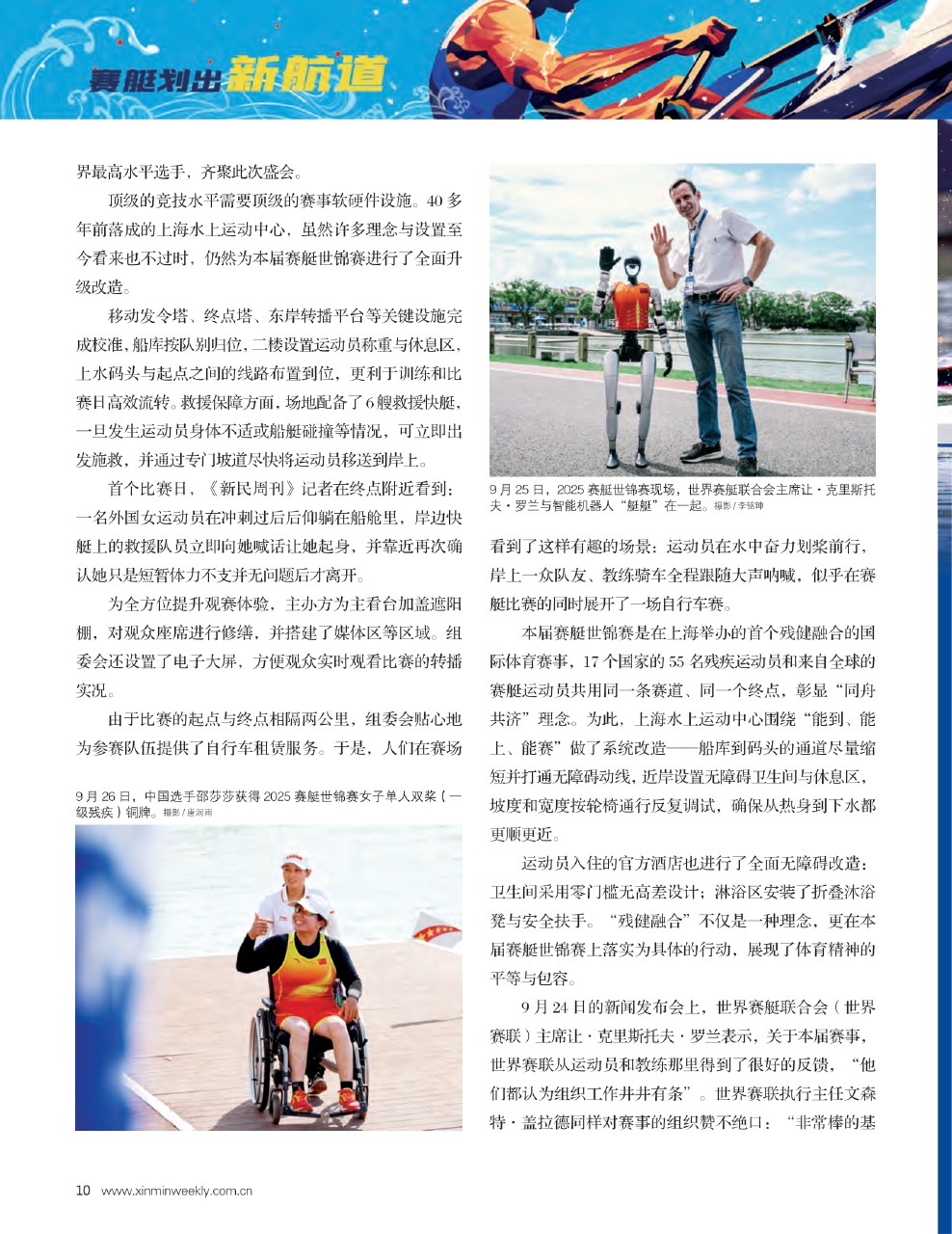 本届赛艇世锦赛是在上海举办的首个残健融合的国际体育赛事,17个国家的55名残疾运动员和来自全球的赛艇运动员共用同一条赛道、同一个终点,彰显“同舟共济”理念。为此,上海水上运动中心围绕“能到、能上、能赛”做了系统改造——船库到码头的通道尽量缩短并打通无障碍动线,近岸设置无障碍卫生间与休息区,坡度和宽度按轮椅通行反复调试,确保从热身到下水都更顺更近。
