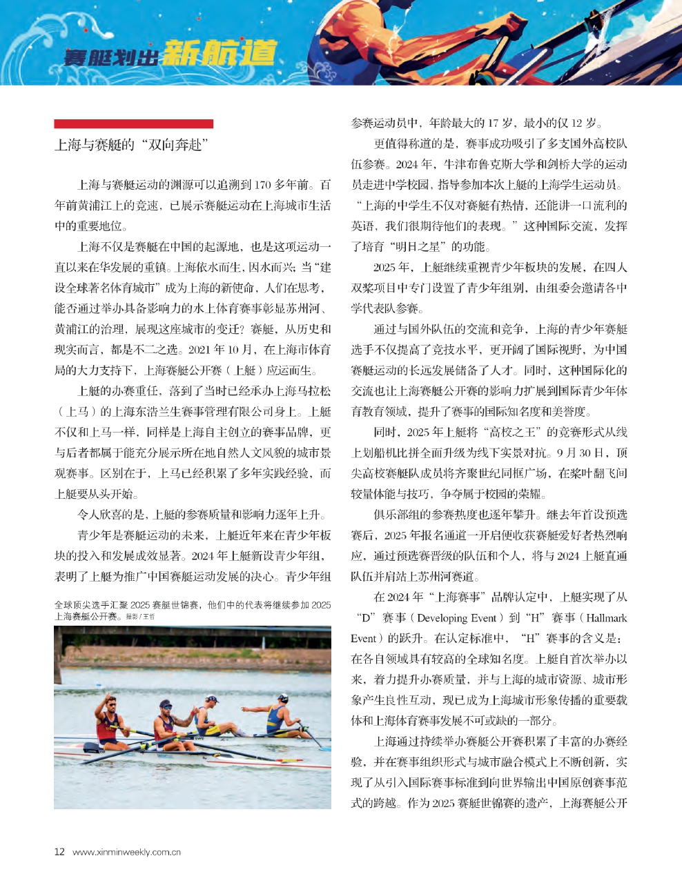 从苏州河上的百年回响到淀山湖畔的世界舞台,上海与赛艇运动的“双向奔赴”,赛艇世锦赛与上海赛艇公开赛的“双赛联动”,书写了体育与城市共生共荣的精彩篇章。在赛艇运动的推动下,上海正以更加开放、奋进、时尚的姿态,向世界展示其独特的城市魅力和无限活力。