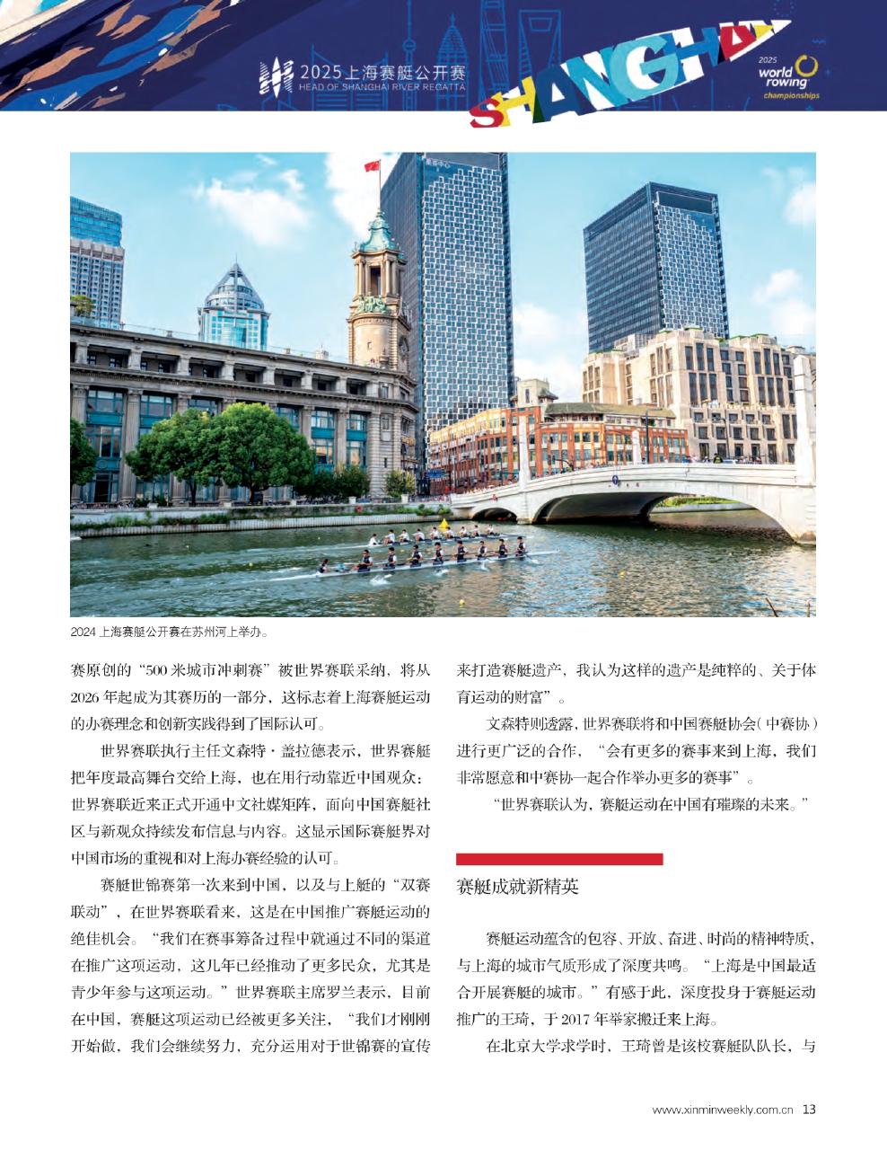 从苏州河上的百年回响到淀山湖畔的世界舞台,上海与赛艇运动的“双向奔赴”,赛艇世锦赛与上海赛艇公开赛的“双赛联动”,书写了体育与城市共生共荣的精彩篇章。在赛艇运动的推动下,上海正以更加开放、奋进、时尚的姿态,向世界展示其独特的城市魅力和无限活力。