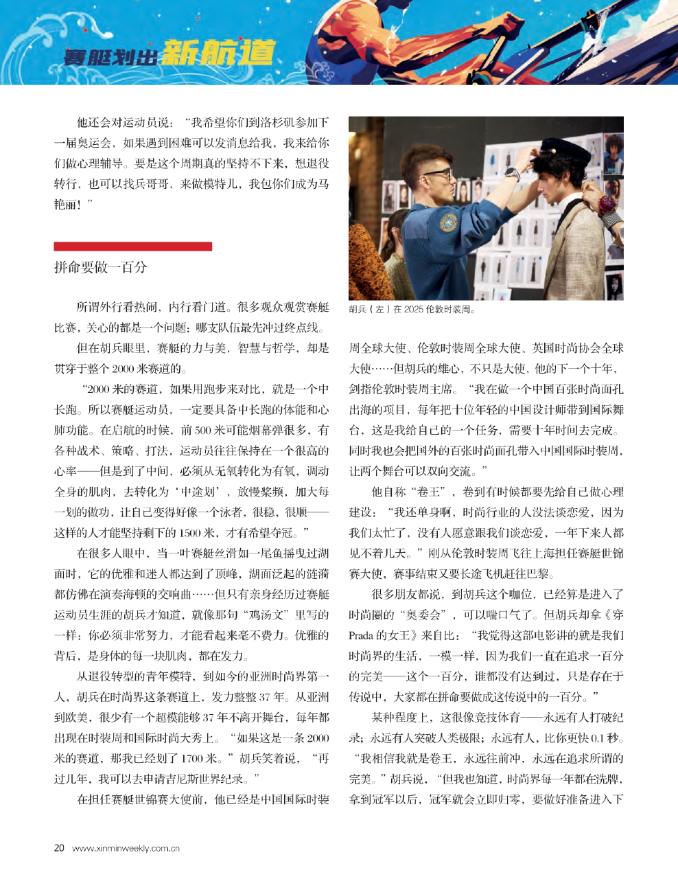 在担任赛艇世锦赛大使前,他已经是中国国际时装周全球大使、伦敦时装周全球大使、英国时尚协会全球大使……但胡兵的雄心,不只是大使,他的下一个十年,剑指伦敦时装周主席。“我在做一个中国百张时尚面孔出海的项目,每年把十位年轻的中国设计师带到国际舞台,这是我给自己的一个任务,需要十年时间去完成。同时我也会把国外的百张时尚面孔带入中国国际时装周,让两个舞台可以双向交流。”