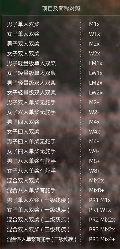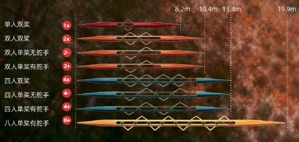赛艇运动根据桨手人数、体重、操桨方式及有无舵手,可分成共8种赛艇比赛项目: