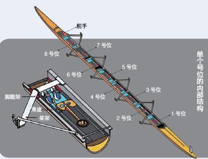 赛艇上每名桨手都有固定的位置,不能随便换位置。赛艇上每个位置的分工也是不一样的,以最能表现团队合作精神的八人艇为例: