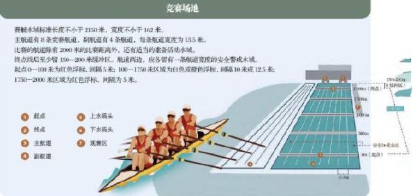 赛艇水域标准长度不小于2150米,宽度不小于162米。