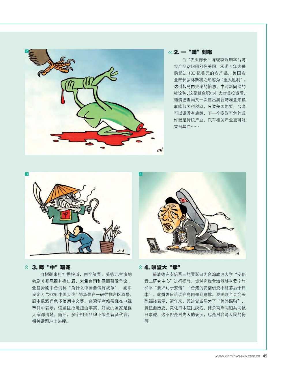 4.哄堂大“孝” 赖清德在安倍晋三的冥诞日为台湾政治大学“安倍晋三研究中心”进行揭牌,竟然声称台海能够享受宁静和平“要归功于安倍”“台湾的安倍研究不能落后于日本”。此番媚日论调在岛内遭到痛批。夏潮联合会会长陈福裕表示,近年来,民进党当局为了“倚外谋独”,竟扭曲历史,美化日本殖民统治,抹杀两岸同胞共同抗日事迹,这不但是对先人的亵渎,也是对台湾人民的侮辱。