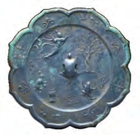 唐。镜为八瓣菱花形,伏兽钮。铜镜背面是一幅月宫图。钮右上方饰一株桂树,枝繁叶茂;嫦娥身姿飘逸,一手托盘,一手托幅,上有“大吉”二字。镜钮下方有一潭池水,左侧玉兔正持杵捣药,池水右边为一跳跃的蟾蜍。镜边缘饰蝴蝶、花朵及云纹。整个纹饰突出了月宫的主题,且构图十分新颖。