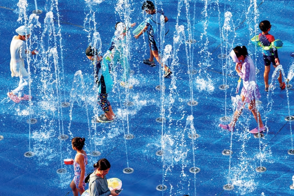 上图:2025年8月,南京高温天气持续,民众涌入水上乐园戏水享清凉。