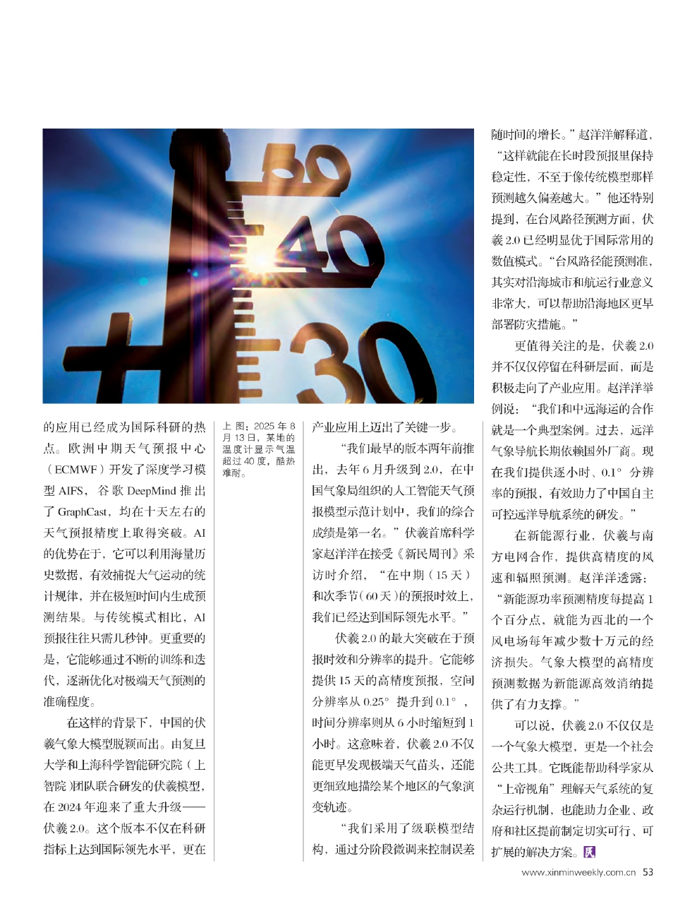 “我们最早的版本两年前推出,去年6月升级到2.0,在中国气象局组织的人工智能天气预报模型示范计划中,我们的综合成绩是第一名。”伏羲首席科学家赵洋洋在接受《新民周刊》采访时介绍,“在中期(15天)和次季节(60天)的预报时效上,我们已经达到国际领先水平。”