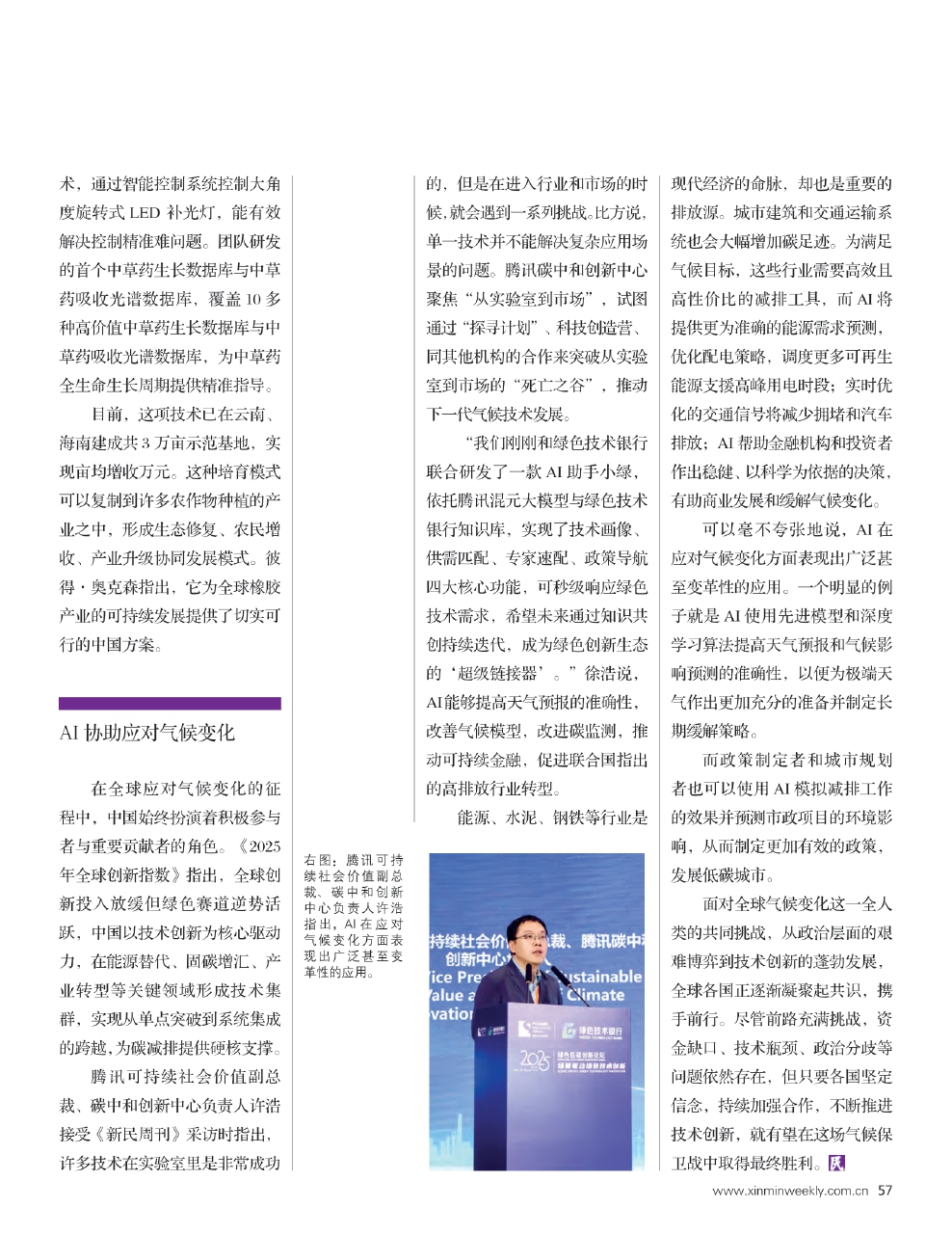 右图:腾讯可持续社会价值副总裁、碳中和创新中心负责人许浩指出,AI在应对气候变化方面表现出广泛甚至变革性的应用。
