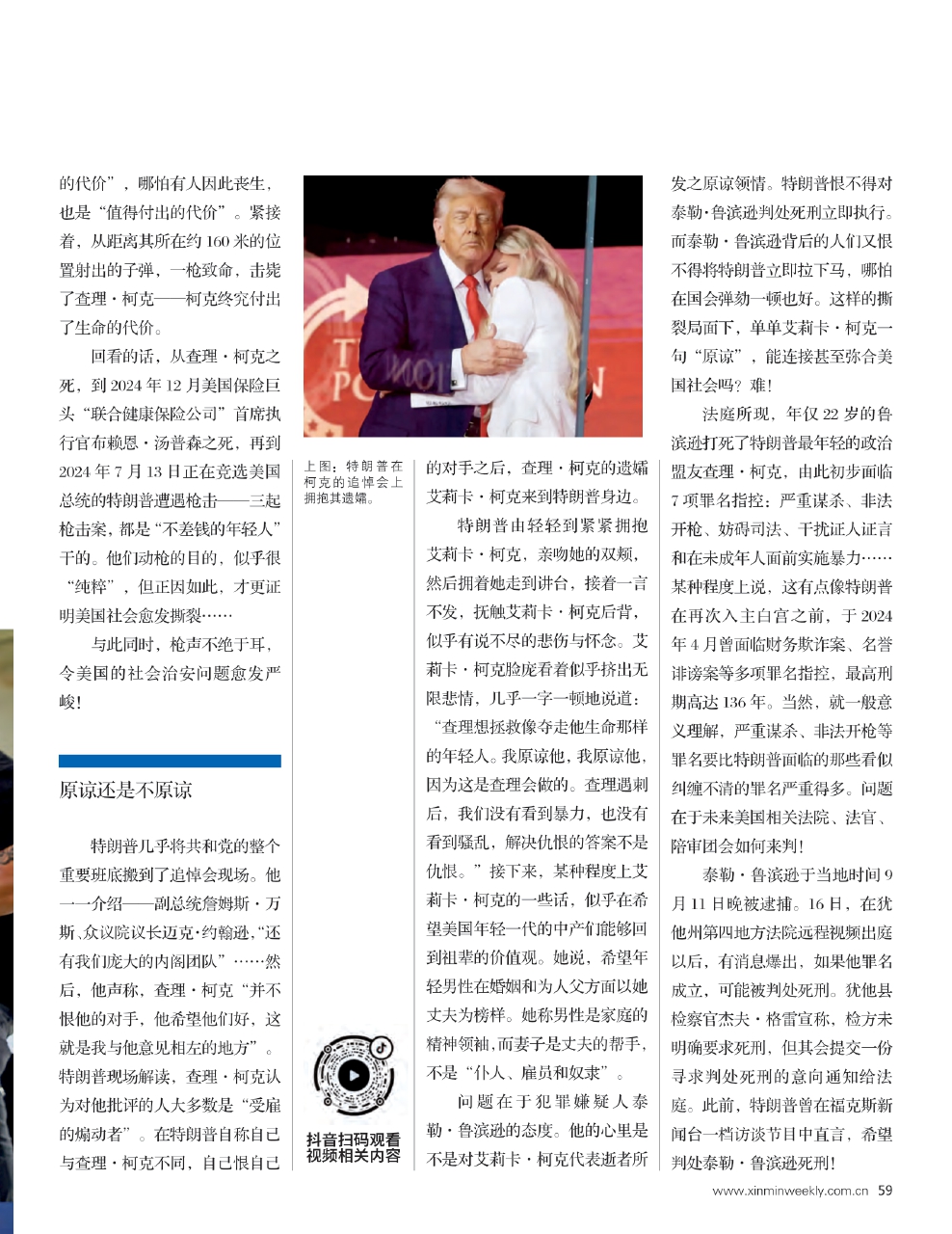 问题在于犯罪嫌疑人泰勒·鲁滨逊的态度。他的心里是不是对艾莉卡·柯克代表逝者所发之原谅领情。特朗普恨不得对泰勒·鲁滨逊判处死刑立即执行。而泰勒·鲁滨逊背后的人们又恨不得将特朗普立即拉下马,哪怕在国会弹劾一顿也好。这样的撕裂局面下,单单艾莉卡·柯克一句“原谅”,能连接甚至弥合美国社会吗?难!
