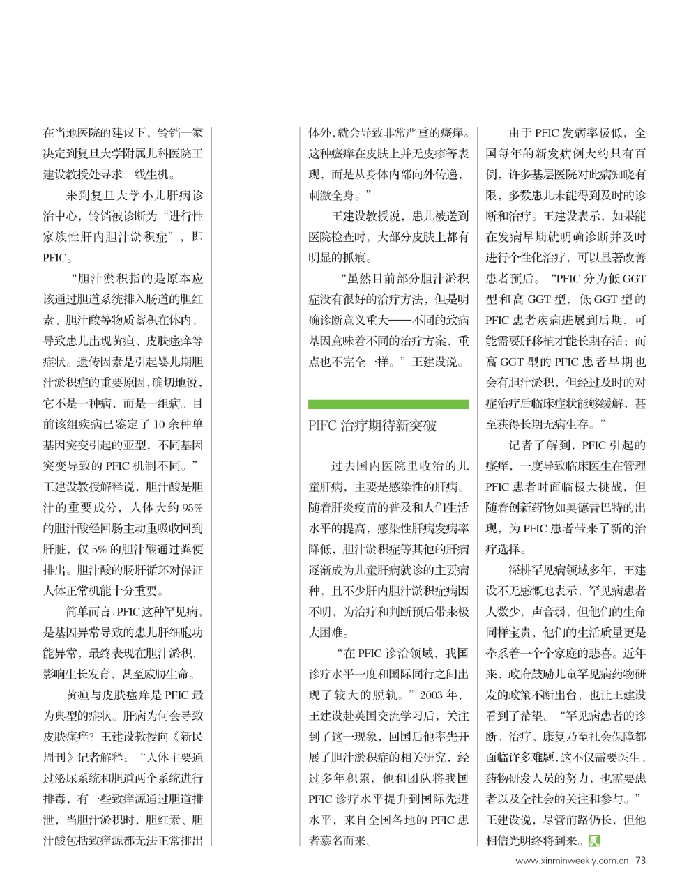 “在PFIC诊治领域,我国诊疗水平一度和国际同行之间出现了较大的脱轨。”2003年,王建设赴英国交流学习后,关注到了这一现象,回国后他率先开展了胆汁淤积症的相关研究,经过多年积累,他和团队将我国PFIC诊疗水平提升到国际先进水平,来自全国各地的PFIC患者慕名而来。