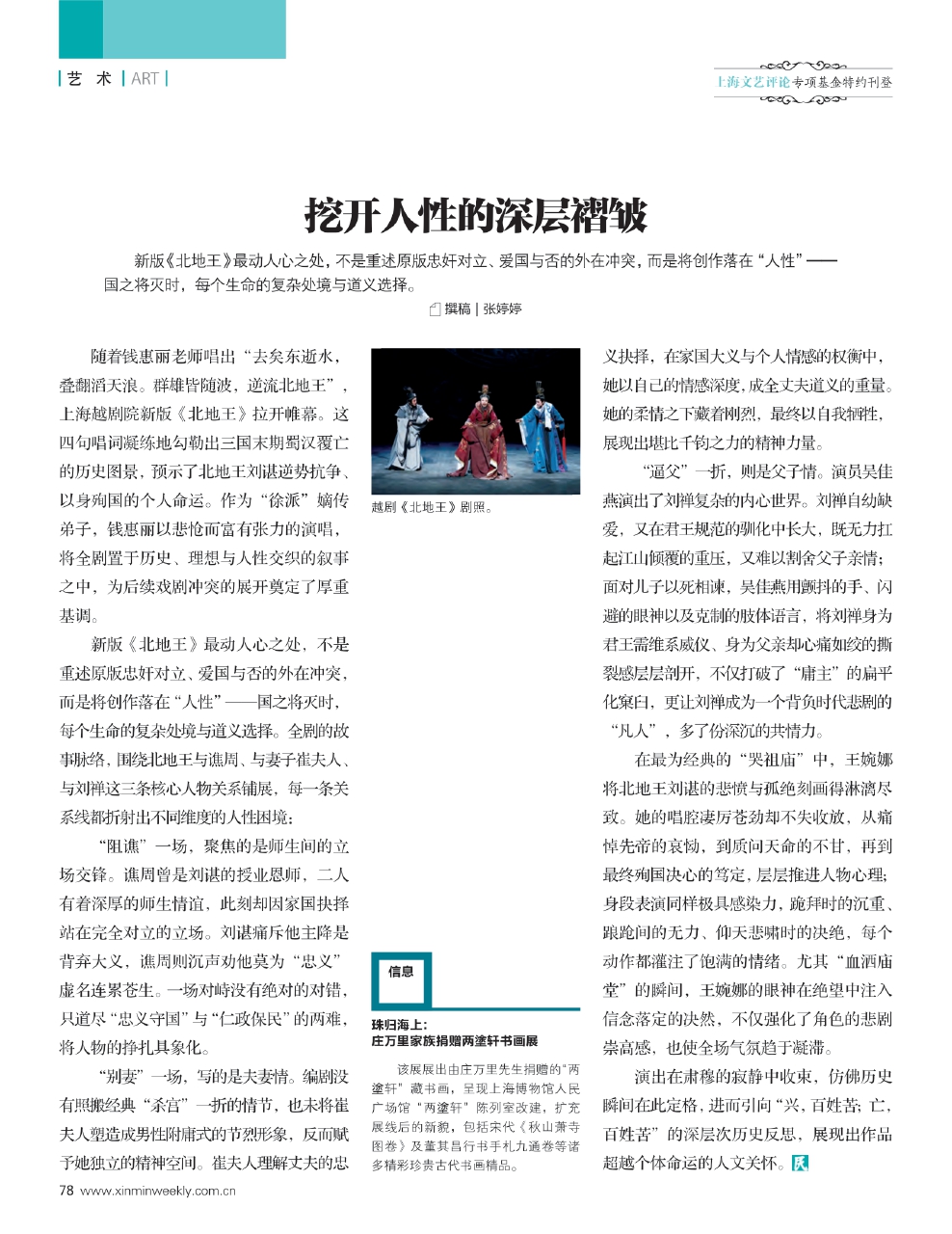 随着钱惠丽老师唱出“去矣东逝水,叠翻滔天浪。群雄皆随波,逆流北地王”,上海越剧院新版《北地王》拉开帷幕。这四句唱词凝练地勾勒出三国末期蜀汉覆亡的历史图景,预示了北地王刘谌逆势抗争、以身殉国的个人命运。作为“徐派”嫡传弟子,钱惠丽以悲怆而富有张力的演唱,将全剧置于历史、理想与人性交织的叙事之中,为后续戏剧冲突的展开奠定了厚重基调。