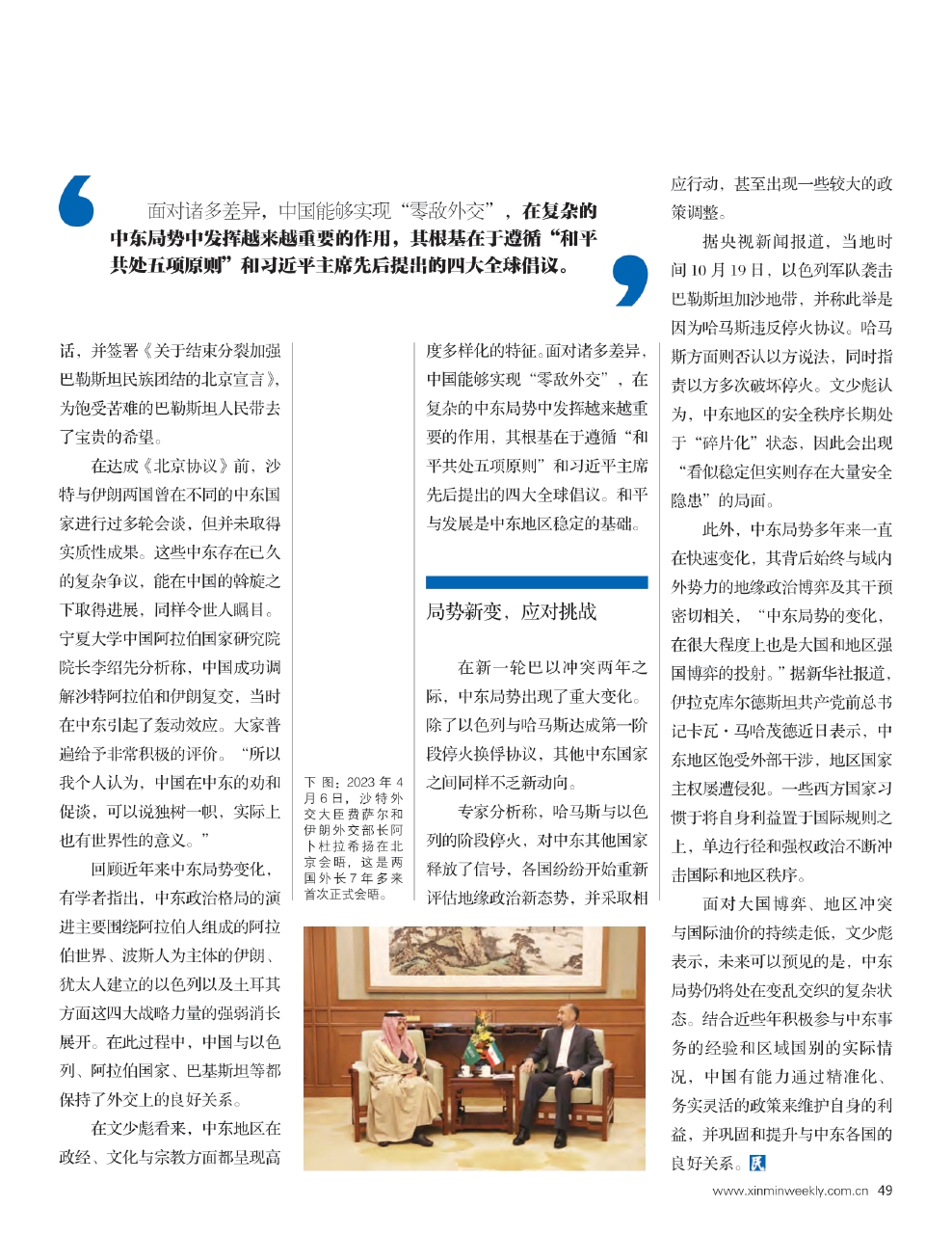 文少彪认为,面对中东局势不断变化与动荡,中国作为负责任的大国,坚定做动荡世界中的稳定力量,积极斡旋中东国家与地区间的分歧,符合中东国家及国际社会对中国的期待。
