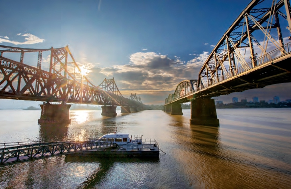 下图:2024年9月30日,辽宁丹东鸭绿江中朝友谊桥风光。