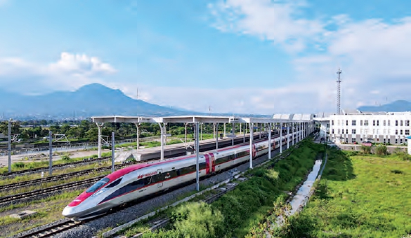 上图:5月20日,在印度尼西亚万隆,一列雅万高铁高速动车组列车驶出德卡鲁尔站(无人机照片)。印度尼西亚雅万高铁是中国和印尼共建“一带一路”合作旗舰项目,连接雅加达与万隆。万隆因1955年召开亚非会议而著名。