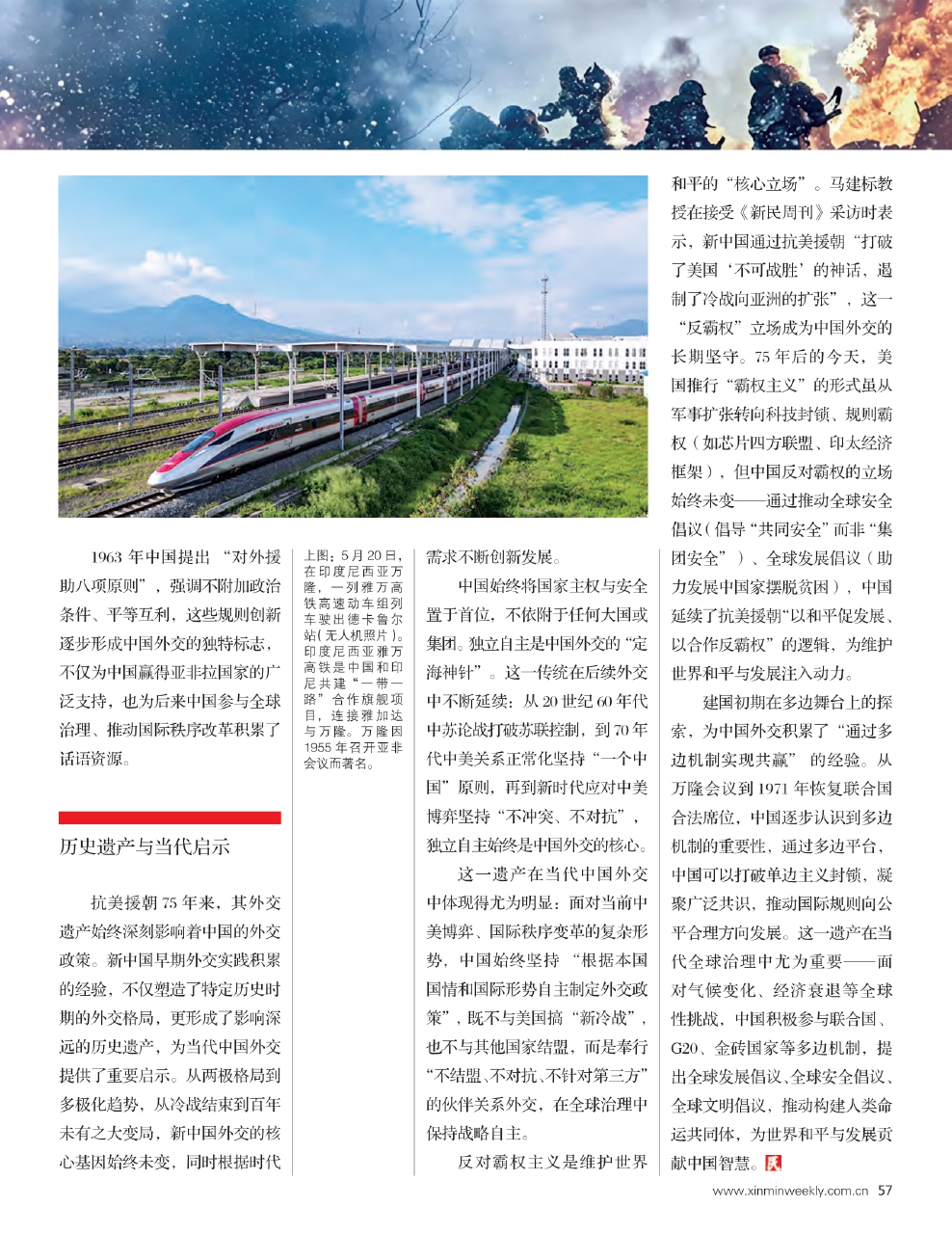 抗美援朝75年来,其外交遗产始终深刻影响着中国的外交政策。新中国早期外交实践积累的经验,不仅塑造了特定历史时期的外交格局,更形成了影响深远的历史遗产,为当代中国外交提供了重要启示。