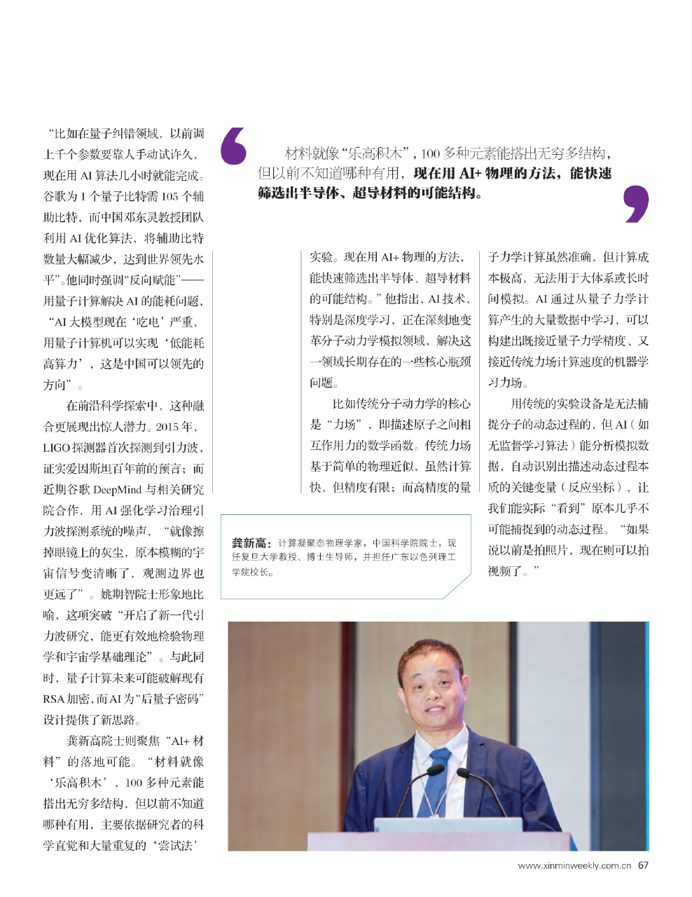 作为复旦大学计算物质科学研究所所长,龚新高致力于推动人工智能与物质科学的深度交叉融合。2024年,国内第一个“AI+物理”的数智中心在复旦大学成立,2025年复旦大学物理系更是首次设立了量子智能英才班,尝试更多地加入创新人才培养理念与中国教育实践相结合,探索人才培养的新模式。