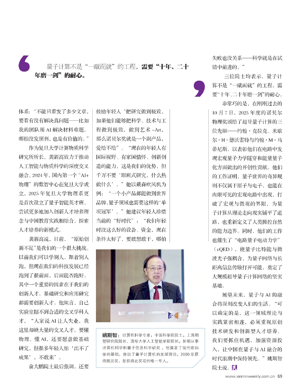作为下一代信息技术的“皇冠明珠”,量子计算正重塑大国科技战略竞争格局,各国均在推动量子计算从基础研究方向向工程化、产业化快速迈进。中国如何在技术突破、产业落地、人才培养上实现从“并跑”到“领跑”的跨越?《新民周刊》记者在会后采访了姚期智、俞大鹏、龚新高三位中国科学院院士,解码中国量子计算的现状与未来。