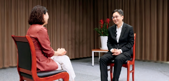 上图:松江区委书记王华杰(右)在节目中介绍,上海市松江区与西藏、云南、安徽、辽宁的11个县区开展结对共建,累计实施帮扶项目705个,输送援外干部及专业人才246人。