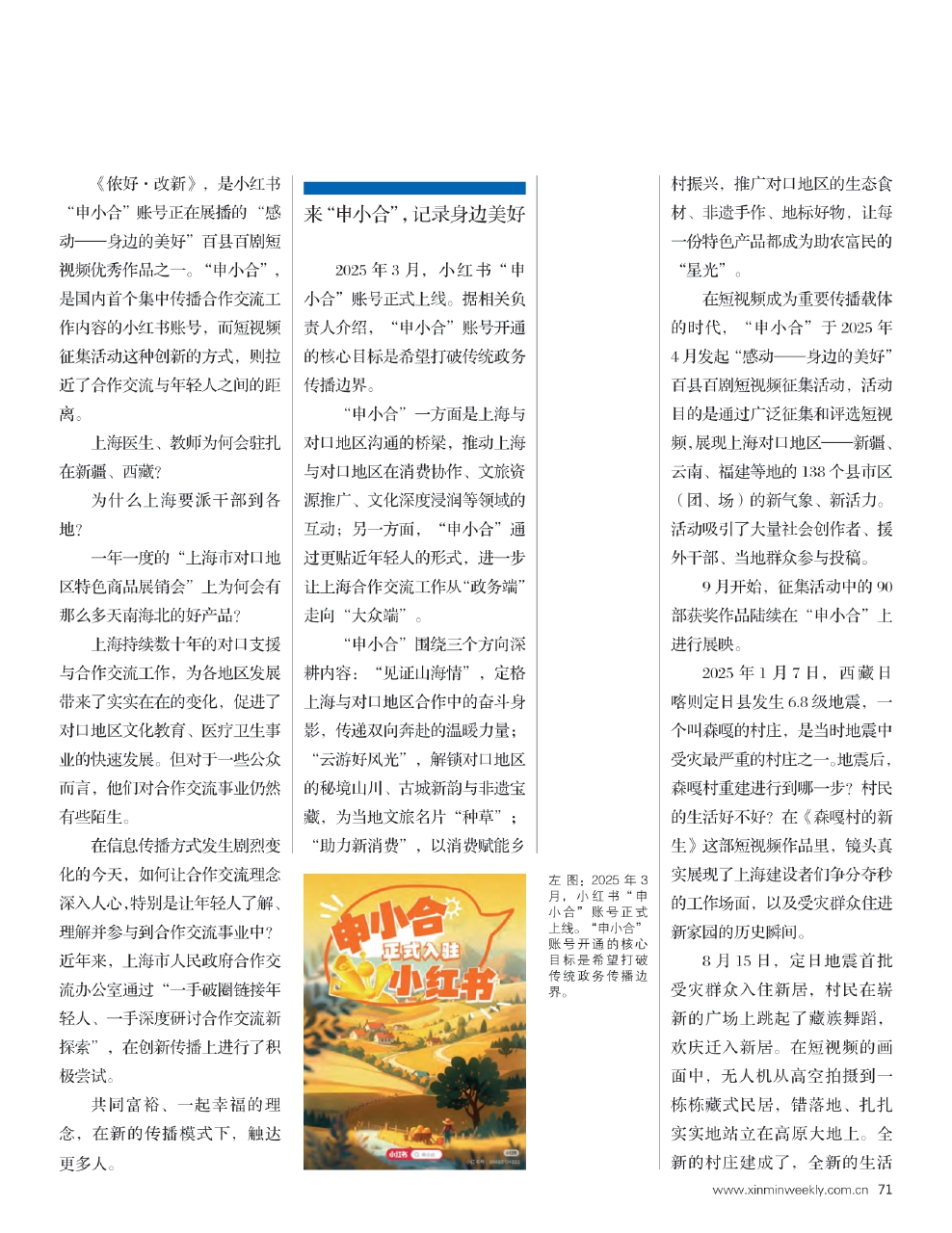 “申小合”围绕三个方向深耕内容:“见证山海情”,定格上海与对口地区合作中的奋斗身影,传递双向奔赴的温暖力量;“云游好风光”,解锁对口地区的秘境山川、古城新韵与非遗宝藏,为当地文旅名片“种草”;“助力新消费”,以消费赋能乡村振兴,推广对口地区的生态食材、非遗手作、地标好物,让每一份特色产品都成为助农富民的“星光”。