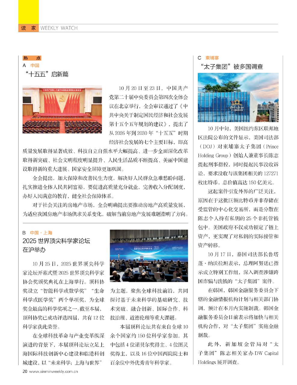 10月20日至23日,中国共产党第二十届中央委员会第四次全体会议在北京举行,全会审议通过了《中共中央关于制定国民经济和社会发展第十五个五年规划的建议》,提出了从2026年到2030年“十五五”时期经济社会发展的七个主要目标,即高质量发展取得显著成效、科技自立自强水平大幅提高、进一步全面深化改革取得新突破、社会文明程度明显提升、人民生活品质不断提高、美丽中国建设取得新的重大进展、国家安全屏障更加巩固。