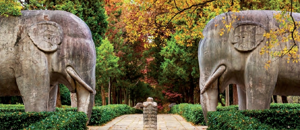 秋季里偷闲去南京明孝陵一游,神道上最美的风景,莫过于延绵600米的石象路。红橙黄绿的彩叶树种掩映下,巍峨石兽们或跪或立,具有极强的视觉冲击力。个子略矮些的石兽脊背,都被骑坐或抚摸得溜光水滑,有一些犄角已然破损,大多身上有对称的浅浅圆坑痕迹,似乎曾经被镶嵌了宝石。这些静默屹立的石兽,在一代代人的仰望与触摸中,把历史的温度留在了肌肤纹理之间。