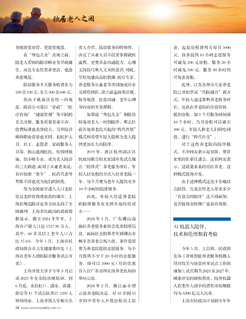 《新民周刊》发现,从陪诊师到“外包儿女”,从“跨代共居”的养老社区到AI陪伴机器人,近几年出现的养老产品和服务愈来愈关注老年群体当中那些无法被量化的东西——爱、陪伴和尊严。