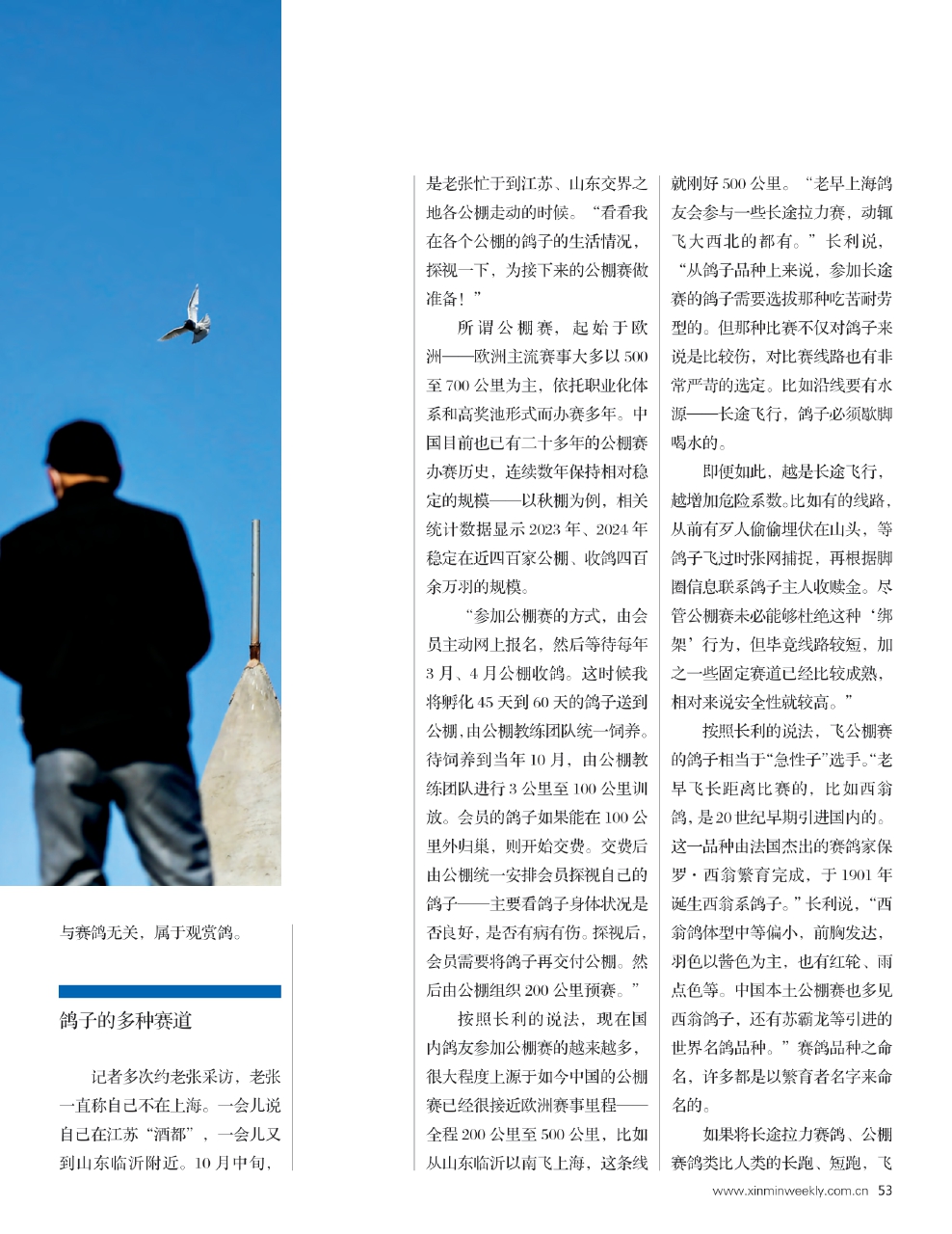 按照长利的说法,现在国内鸽友参加公棚赛的越来越多,很大程度上源于如今中国的公棚赛已经很接近欧洲赛事里程——全程200公里至500公里,比如从山东临沂以南飞上海,这条线就刚好500公里。“老早上海鸽友会参与一些长途拉力赛,动辄飞大西北的都有。”长利说,“从鸽子品种上来说,参加长途赛的鸽子需要选拔那种吃苦耐劳型的。但那种比赛不仅对鸽子来说是比较伤,对比赛线路也有非常严苛的选定。比如沿线要有水源——长途飞行,鸽子必须歇脚喝水的。