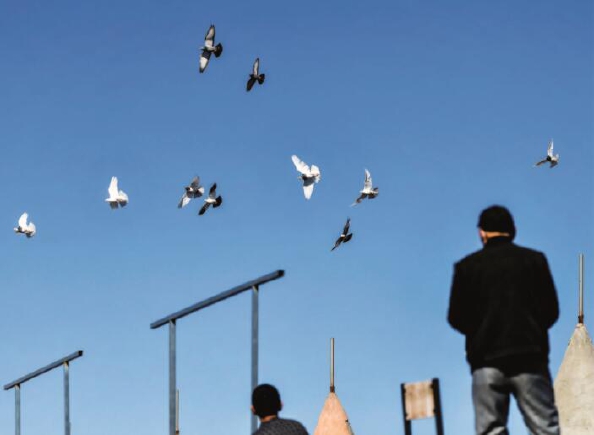 上图:2023年3月10日,新疆乌鲁木齐市,翻翻鸽俱乐部精英对抗赛在该市神木源景区举行,裁判根据鸽子在规定的时间内在空中旋转的周数、转姿、品相等评出获胜鸽子。
