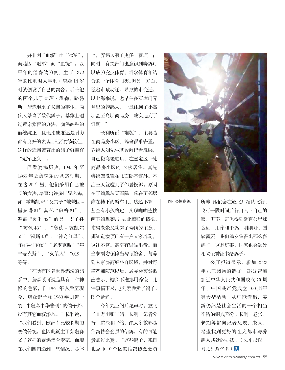 “在所有闻名世界鸽坛的鸽系中,詹森系可说是具有一种神秘的色彩,自1941年以后至现今,詹森鸽舍除1960年引进一羽‘半詹森半华普利’的鸽子外,没有其它血统渗入。”长利说,“我们看到,欧洲有比较长期的赛鸽传统,也因此诞生了如詹森父子这样的赛鸽培育专家。而现在我们国内遇到一些情况:总体上,养鸽人有了更多‘赛道’;同时,有关部门也意识到赛鸽可以成为竞技体育、群众体育相结合的一个体育门类。但另一方面,随着市政动迁,导致城市变迁。以上海来说,老早住在石库门弄堂里的养鸽人,一旦住到了小高层甚至高层商品房,确实遇到了难题。”