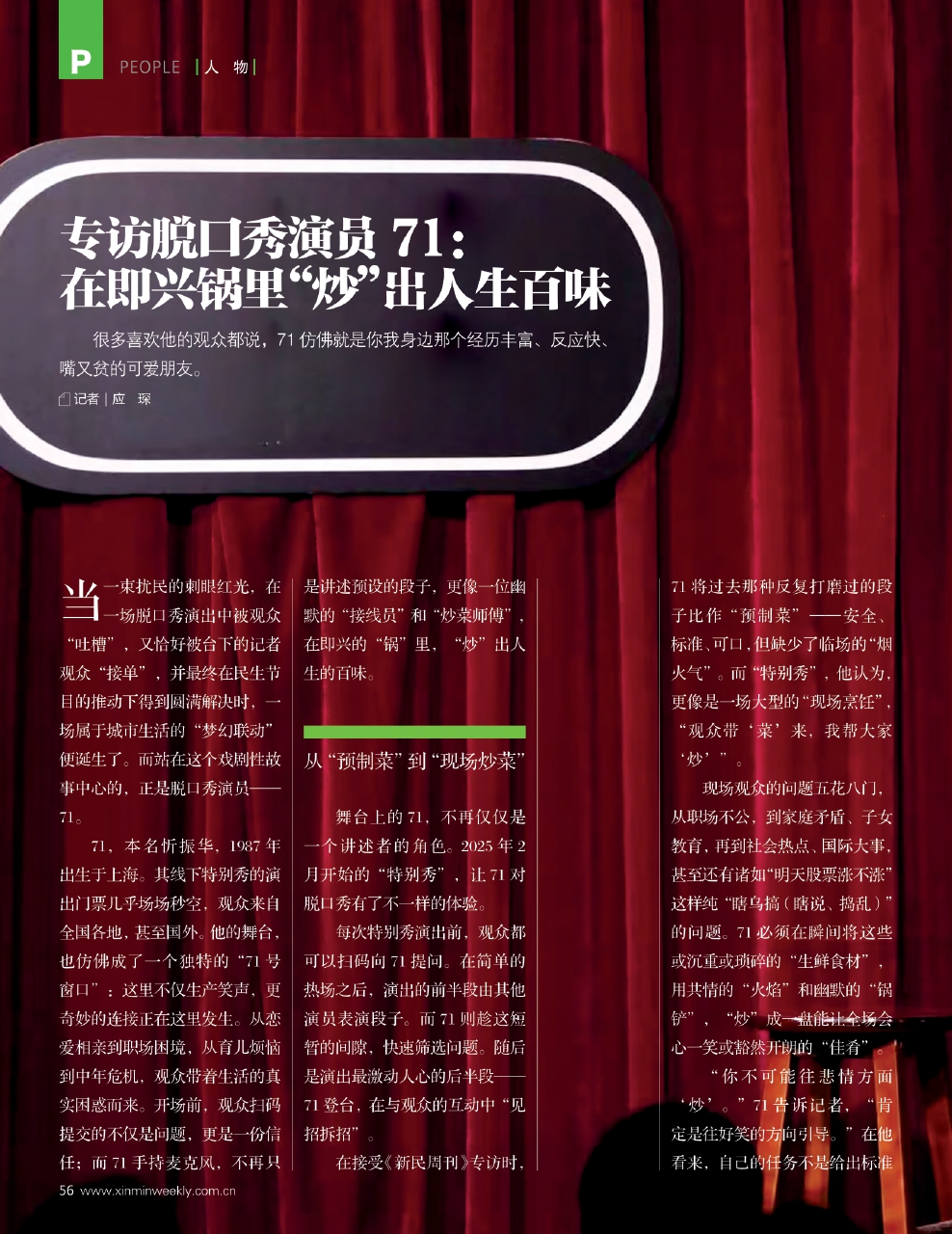 71,本名忻振华,1987年出生于上海。其线下特别秀的演出门票几乎场场秒空,观众来自全国各地,甚至国外。他的舞台,也仿佛成了一个独特的“71号窗口”:这里不仅生产笑声,更奇妙的连接正在这里发生。从恋爱相亲到职场困境,从育儿烦恼到中年危机,观众带着生活的真实困惑而来。开场前,观众扫码提交的不仅是问题,更是一份信任;而71手持麦克风,不再只是讲述预设的段子,更像一位幽默的“接线员”和“炒菜师傅”,在即兴的“锅”里,“炒”出人生的百味。