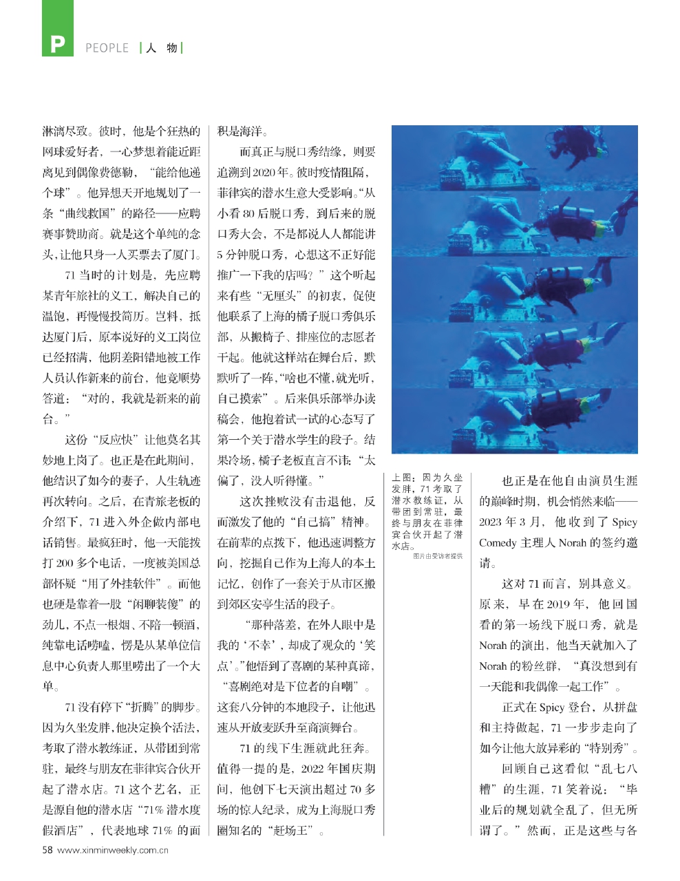 而真正与脱口秀结缘,则要追溯到2020年。彼时疫情阻隔,菲律宾的潜水生意大受影响。“从小看80后脱口秀,到后来的脱口秀大会,不是都说人人都能讲5分钟脱口秀,心想这不正好能推广一下我的店吗?”这个听起来有些“无厘头”的初衷,促使他联系了上海的橘子脱口秀俱乐部,从搬椅子、排座位的志愿者干起。他就这样站在舞台后,默默听了一阵,“啥也不懂,就光听,自己摸索”。后来俱乐部举办读稿会,他抱着试一试的心态写了第一个关于潜水学生的段子。结果冷场,橘子老板直言不讳:“太偏了,没人听得懂。”