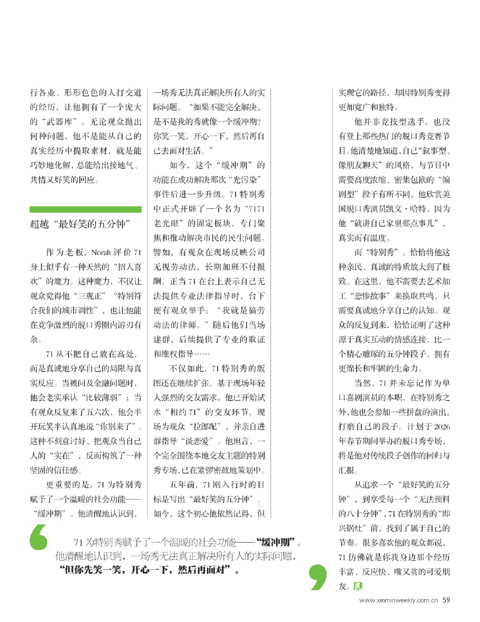 从追求一个“最好笑的五分钟”,到享受每一个“无法预料的八十分钟”,71在特别秀的“即兴锅灶”前,找到了属于自己的节奏。很多喜欢他的观众都说,71仿佛就是你我身边那个经历丰富、反应快、嘴又贫的可爱朋友。