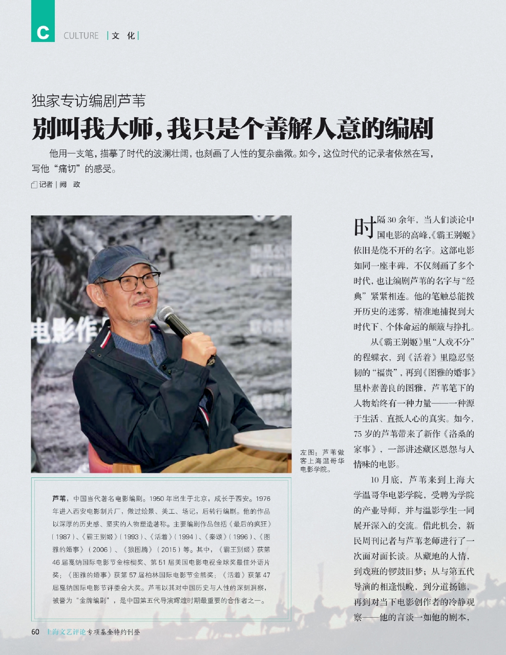 10月底,芦苇来到上海大学温哥华电影学院,受聘为学院的产业导师,并与温影学生一同展开深入的交流。借此机会,新民周刊记者与芦苇老师进行了一次面对面长谈。从藏地的人情,到戏班的锣鼓旧梦;从与第五代导演的相逢恨晚,到分道扬镳,再到对当下电影创作者的冷静观察——他的言谈一如他的剧本,坦诚、冷静、犀利,充满了对生活的虔诚和对艺术的敬畏。