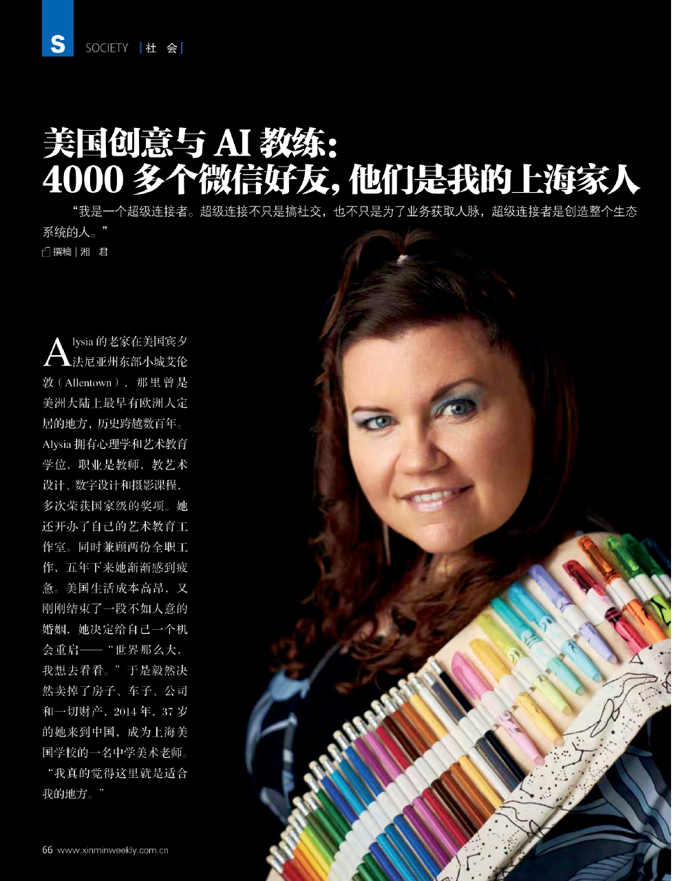 在上海生活了11年,Alysia的微信里有4000多个好友。她为此自豪:“我是一个超级连接者。如果你真的想帮助别人,你能做的最有力的事情之一就是帮助人们建立联系,让他们互相帮助。超级连接不只是搞社交,也不只是为了业务获取人脉,超级连接者是创造整个生态系统的人。”