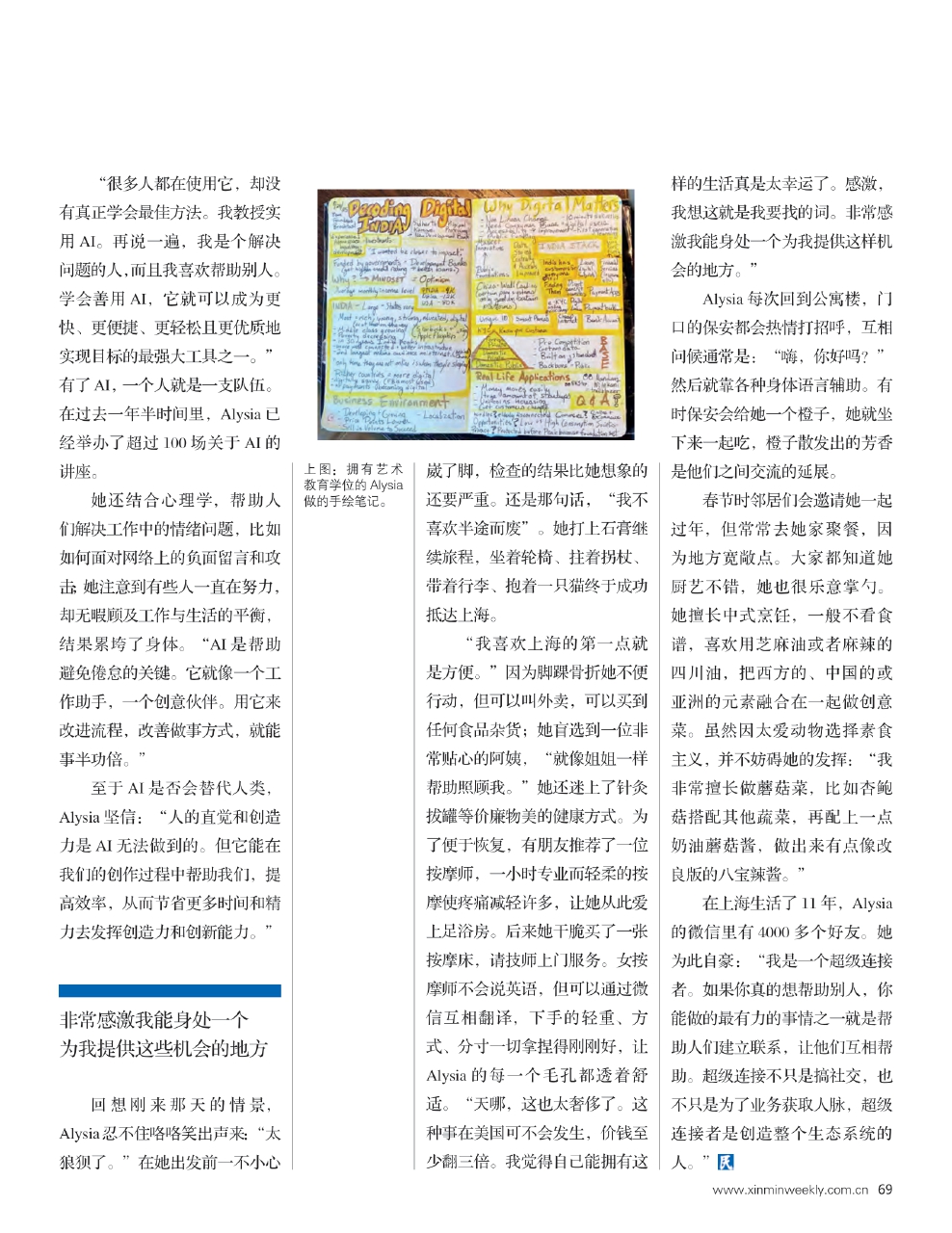 在上海生活了11年,Alysia的微信里有4000多个好友。她为此自豪:“我是一个超级连接者。如果你真的想帮助别人,你能做的最有力的事情之一就是帮助人们建立联系,让他们互相帮助。超级连接不只是搞社交,也不只是为了业务获取人脉,超级连接者是创造整个生态系统的人。”
