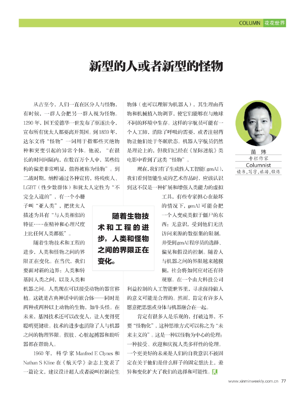 随着生物技术和工程的进步,人类和怪物之间的界限正在变化。在当代,我们要面对新的边界:人类和转基因人类之间,以及人类和机器之间。人类现在可以接受动物的器官移植。这就是古典神话中的嵌合体——同时是两种或两种以上动物的生物,如牛头怪。在未来,基因技术还可以改变人,让人变得更聪明更健壮。技术的进步也消除了人与机器之间的物理界限。假肢、心脏起搏器和助听器都在帮助人。