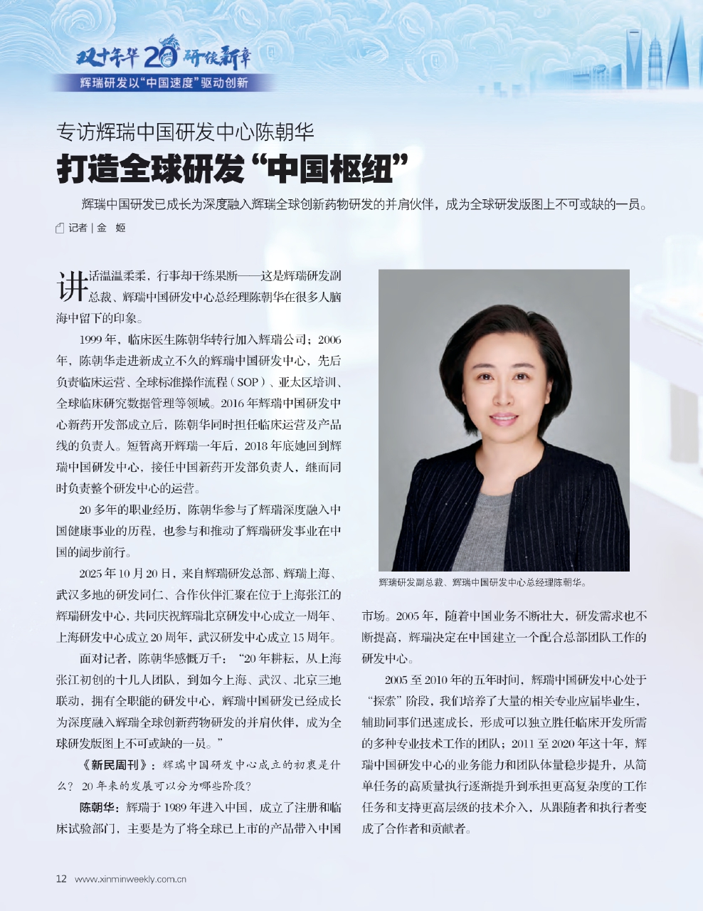 面对记者,陈朝华感慨万千:“20年耕耘,从上海张江初创的十几人团队,到如今上海、武汉、北京三地联动,拥有全职能的研发中心,辉瑞中国研发已经成长为深度融入辉瑞全球创新药物研发的并肩伙伴,成为全球研发版图上不可或缺的一员。”