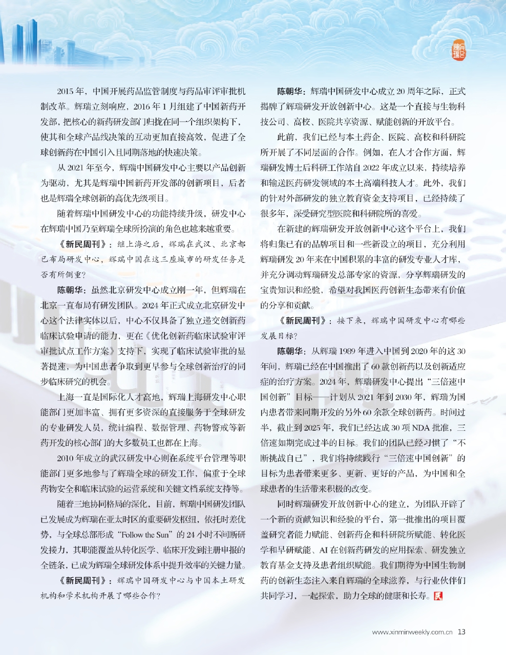 陈朝华:虽然北京研发中心成立刚一年,但辉瑞在北京一直布局有研发团队。2024年正式成立北京研发中心这个法律实体以后,中心不仅具备了独立递交创新药临床试验申请的能力,更在《优化创新药临床试验审评审批试点工作方案》支持下,实现了临床试验审批的显著提速,为中国患者争取到更早参与全球创新治疗的同步临床研究的机会。