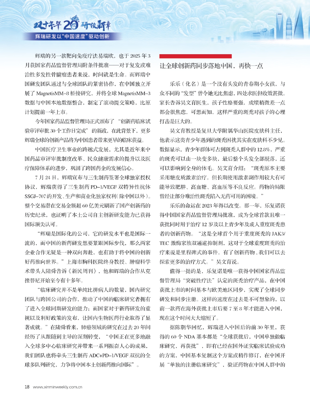 乐乐的命运在2023年得以改变。那一年,乐复诺获得中国国家药品监督管理局批准,成为全球首款且唯一获批同时用于治疗12岁及以上青少年及成人重度斑秃患者的创新药物。“这是全球首个用于重度斑秃的JAK3/TEC激酶家族双通道抑制剂,这对于全球重度斑秃的治疗来说是里程碑式的事件。有了创新药物,我们可以去探索更多的治疗方式。”吴文育说。
