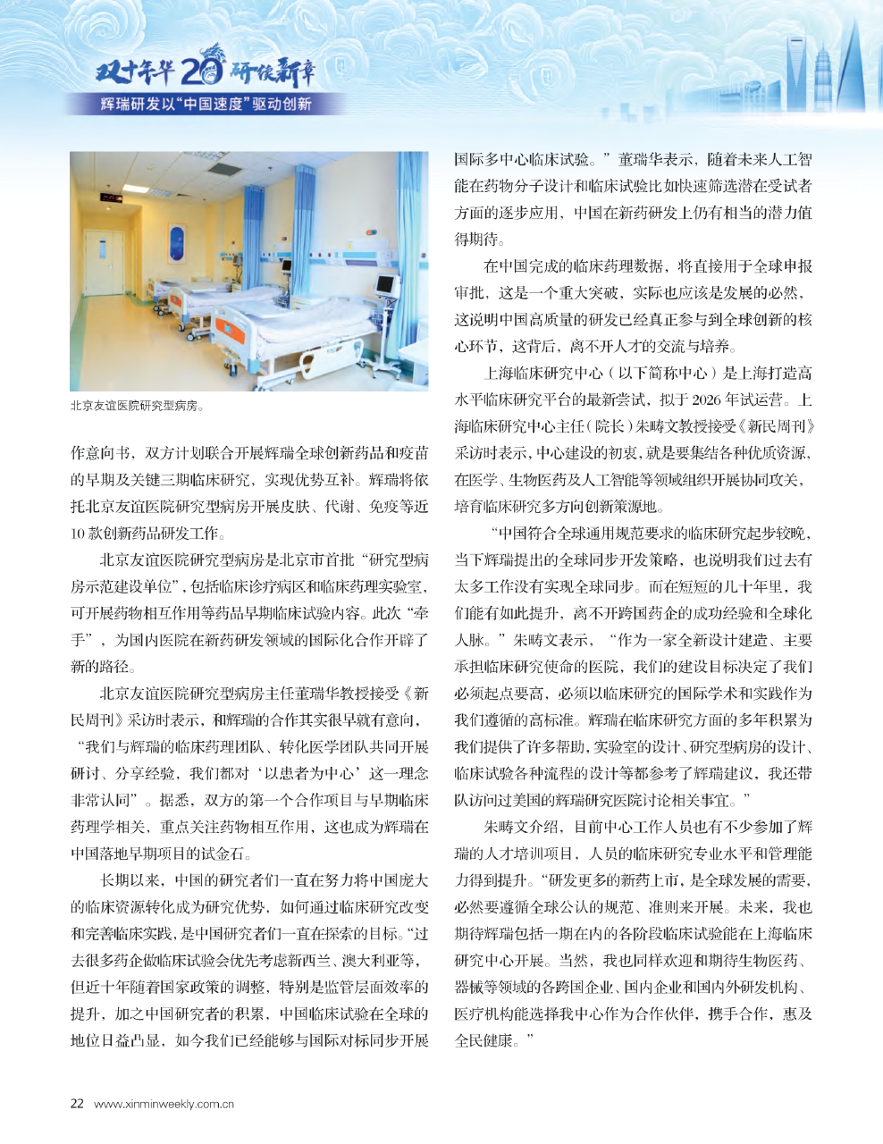 北京友谊医院研究型病房是北京市首批“研究型病房示范建设单位”,包括临床诊疗病区和临床药理实验室,可开展药物相互作用等药品早期临床试验内容。此次“牵手”,为国内医院在新药研发领域的国际化合作开辟了新的路径。